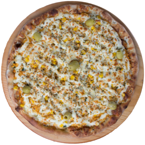 Baked with Mozarella, broccoli, corn, peas, olives and our secret sauce.